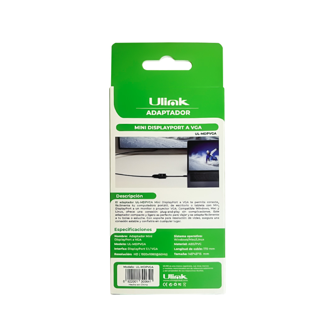 El adaptador Mini DisplayPort a VGA UL-MDPVGA, te permite conectar fácilmente tu computadora portátil, de escritorio o tableta con Mini DisplayPort a un monitor o proyector VGA. Compatible con dispositivos como Microsoft Surface Pro, ofrece una conexión plug-and-play sin complicaciones. Este adaptador compacto y ligero es perfecto para viajar y se adapta fácilmente a tu bolsa o estuche. Con soporte para resolución de video, asegura una conexión estable y confiable en cualquier lugar.
