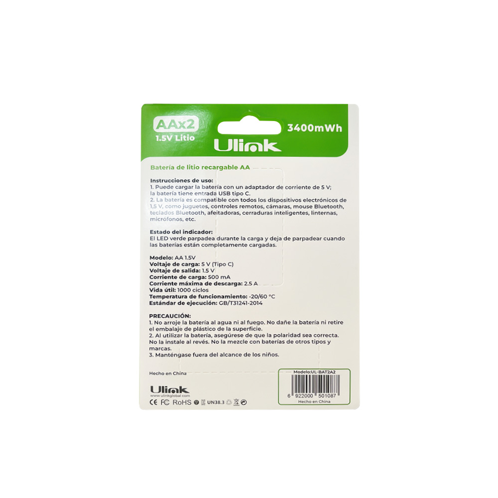 Pilas 2x AA con carga USB C de 3400mWh Mod. UL-BAT2A2